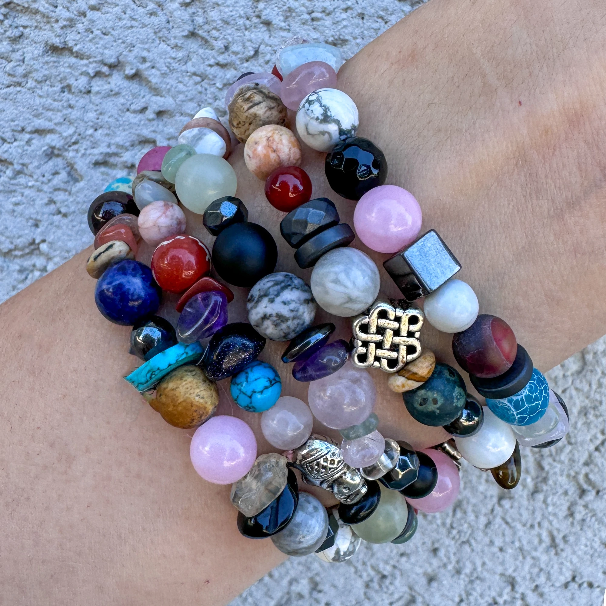 Ez a karkötő véletlenszerűen kiválasztott ásványokból készült, amelyek harmóniát és egyensúlyt hoznak az életedbe. Az univerzum energiái által vezérelt kombináció minden darabot egyedivé tesz. Az ékszer természetes gyöngyökből kézzel készül, így mintázatuk, színük eltérő, a kép csak illusztráció. A karkötők méretét az alábbiak szerint válaszd ki a listából: Mérd meg a csuklód szorosan, és a kapott mérethez adj 1cm-t. Pl: ha a csuklód mérete 16cm, akkor neked 17cm a karkötő méreted. |
