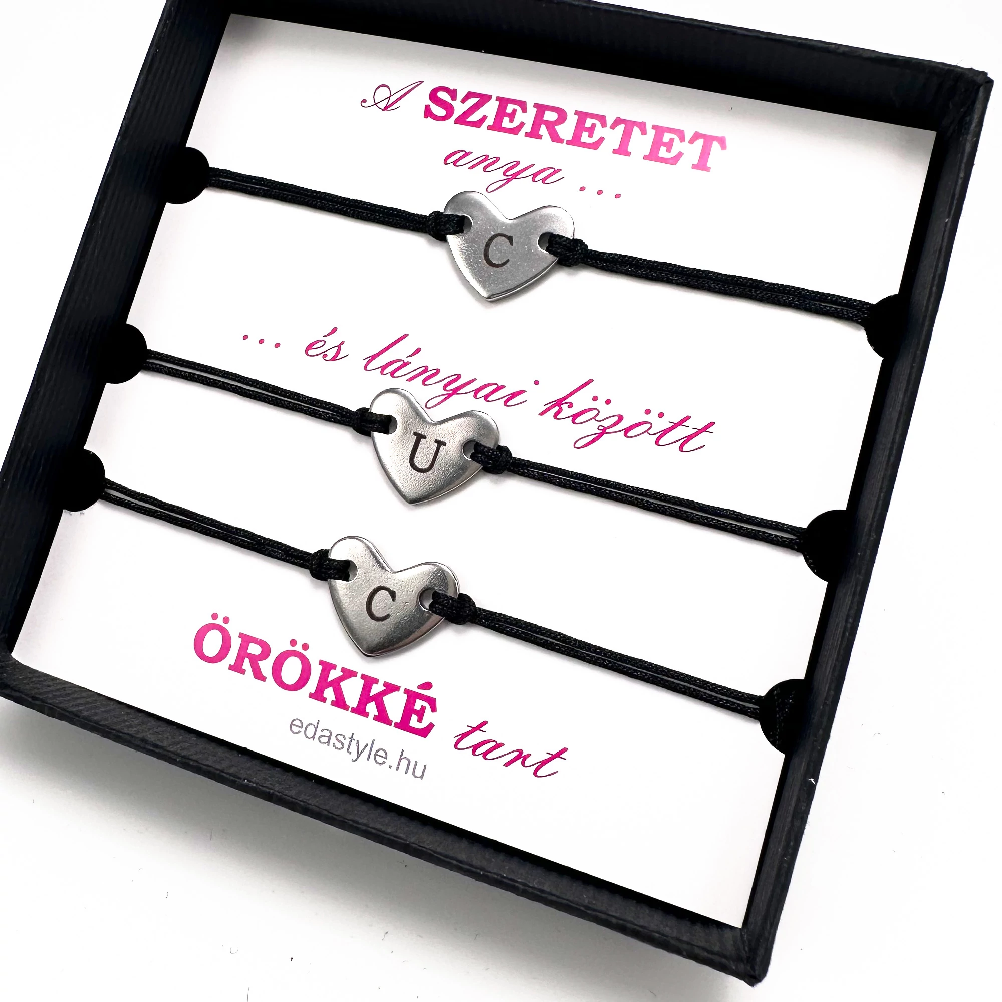 Anya-Lányai zsineg karkötő gravírozható szív medállal Fekete