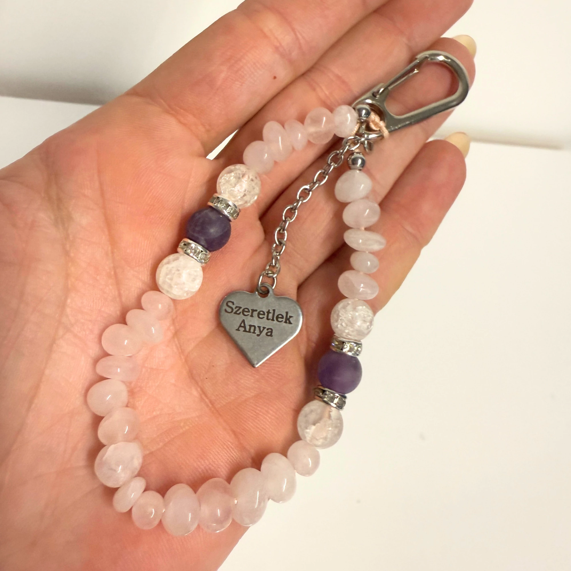 Termék leírás: Fityegő telefonra, táskára kulcstartóraEgyedi gravírozássalHa szereted az egyedi, személyes kiegészítőket, ez az ásványgyöngyökből készült fityegő garantáltan a kedvenced lesz. Nemcsak stílusos, hanem jelentéssel is bír – hiszen minden darab gondosan válogatott ásványokból készül, így nemcsak szép, hanem különleges hangulatot is hordoz. Használhatod telefondíszként, táskadíszként vagy akár kulcstartóként is – pont úgy, ahogy a mindennapjaidhoz a legjobban passzol. Egy apró, mégis figyelemfelkeltő részlet, ami feldobja a megjelenésed. A fityegő egyik legkülönlegesebb eleme a gravírozható biléta, amelyre saját feliratot kérhetsz. Legyen az egy név, dátum vagy egy rövid üzenet – így válik igazán személyessé és megismételhetetlenné. A gravírozás szövegét egyszerűen megadhatod az oldalsó menüben. Tökéletes választás, ha egy szívhez szóló ajándékot keresel anyák napjára, születésnapra, vagy csak úgy – mert egy ilyen apróság is hatalmas mosolyt tud csalni valaki arcára. |