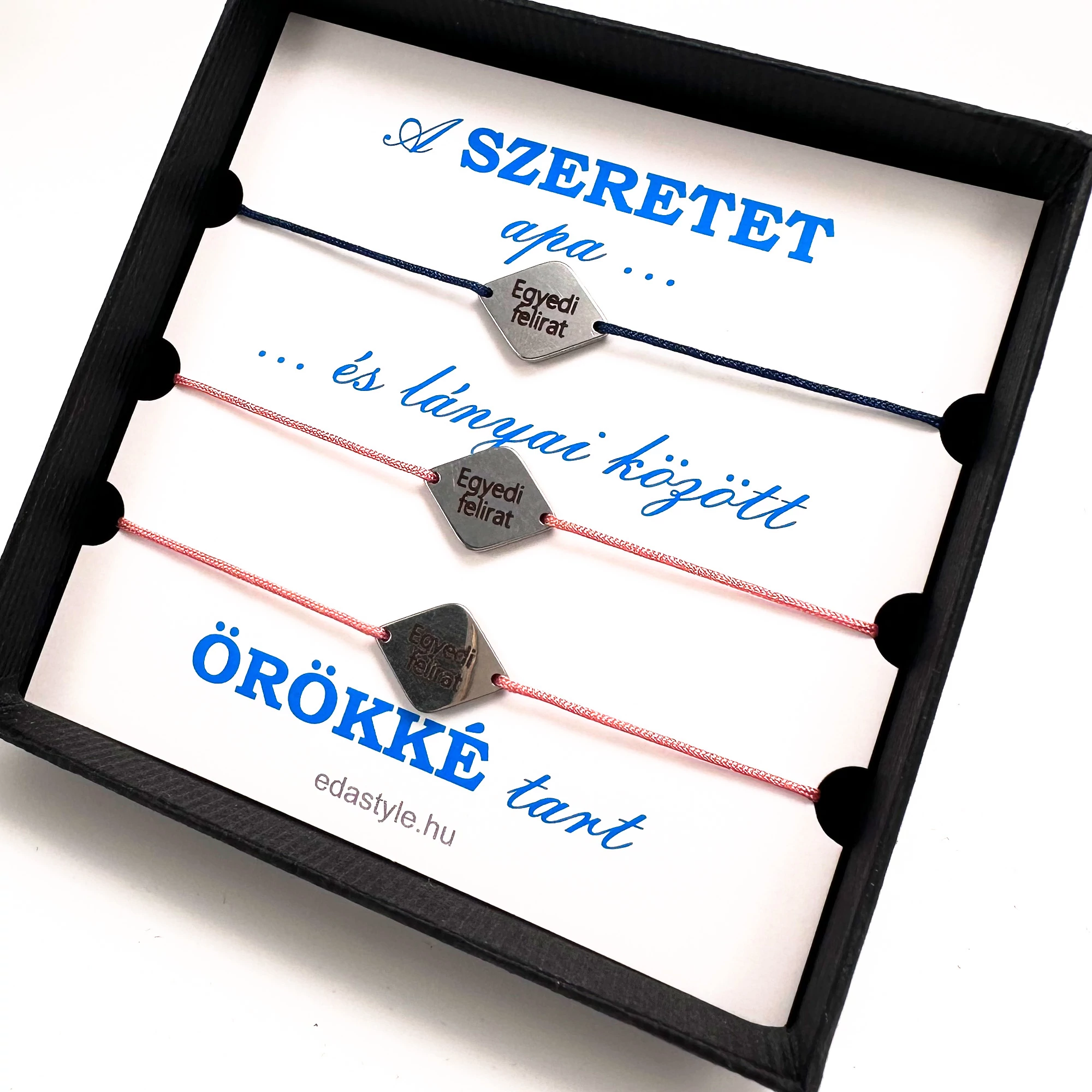 Apa-Lányai zsineg karkötő gravirozható rombusz medállal Kék-Rózsaszín