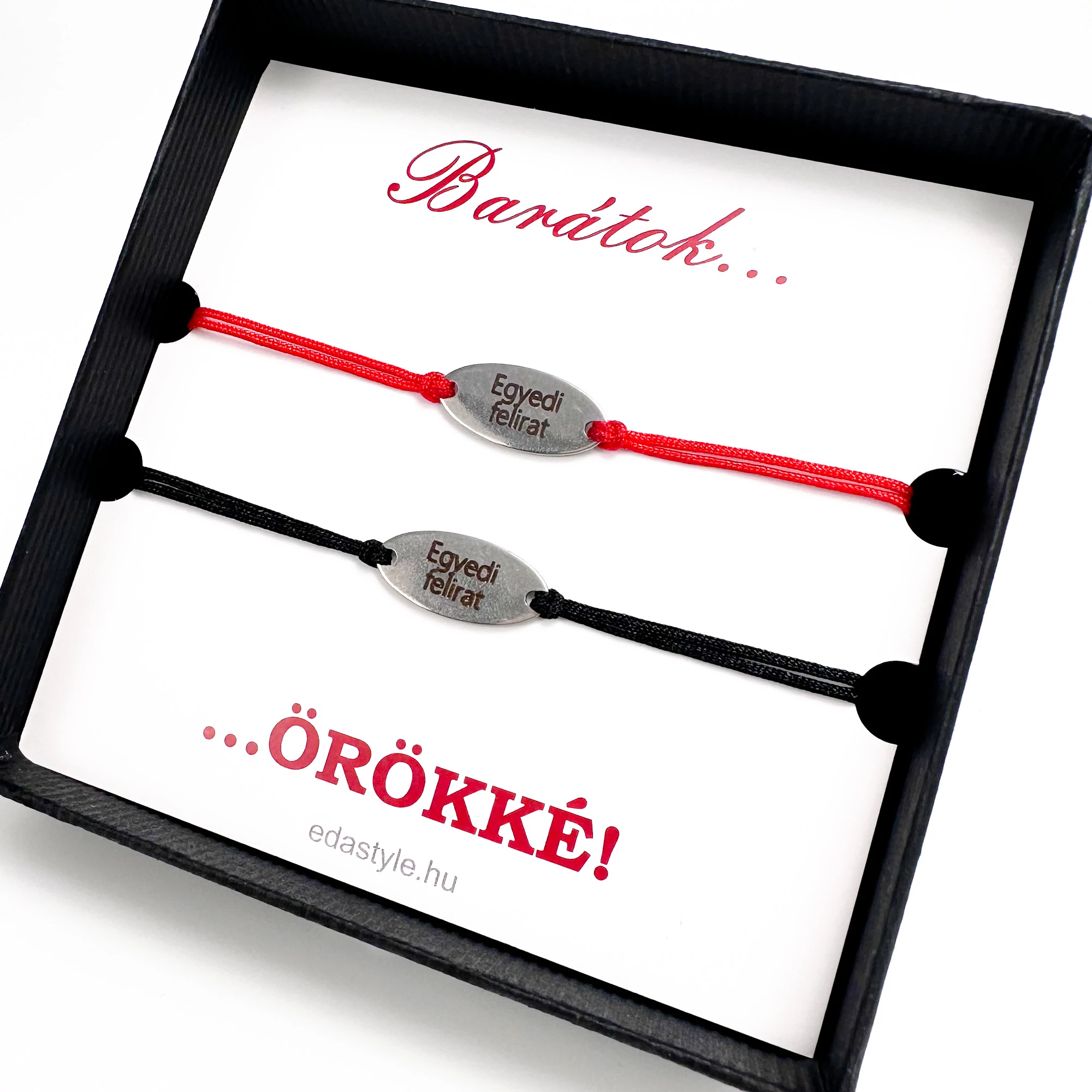 Barátság karkötő EGYEDI gravírozott ovál medállal piros-fekete