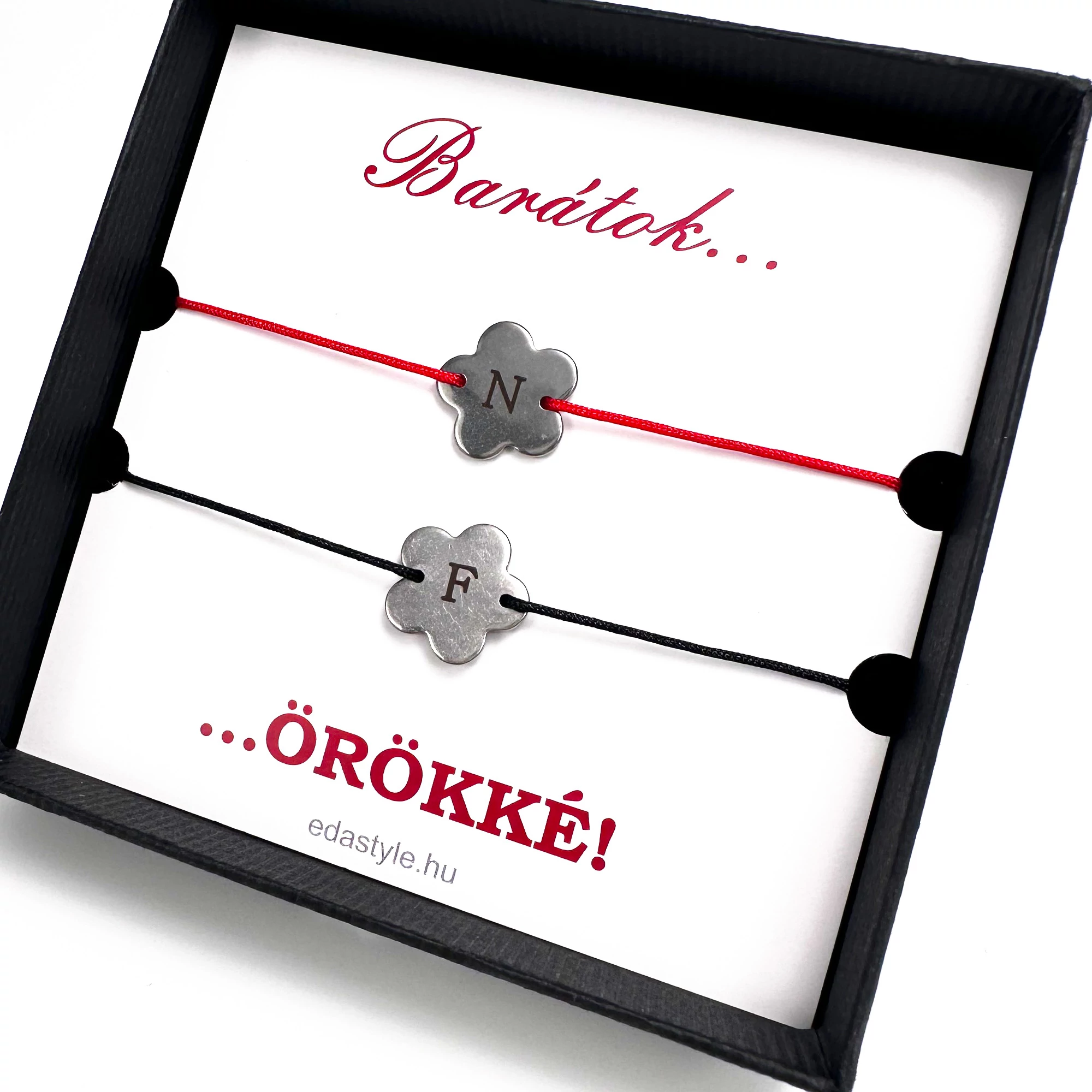 Barátság karkötő EGYEDI gravírozott virág medállal piros-fekete