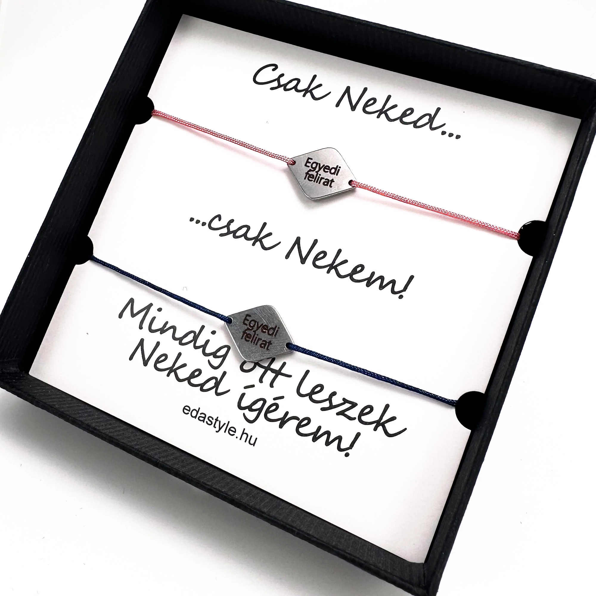 • Az ár 2db karkötőt tartalmaz díszdobozzal, egyedi gravírozással és a képen látható üzenetkártyával együtt.