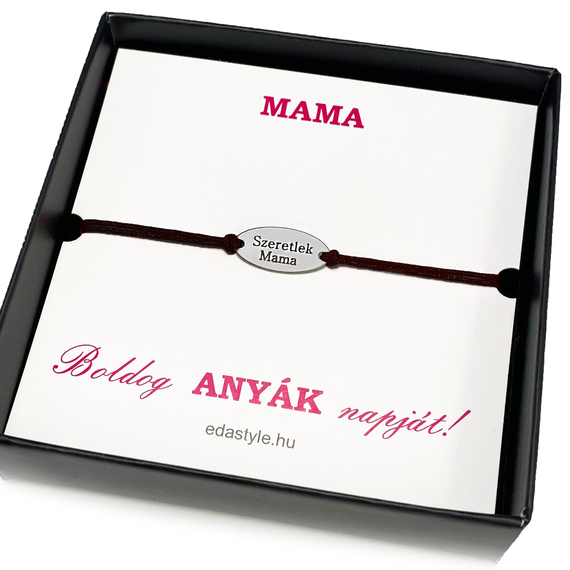 Szeretlek Mama gravírozott acél medálos fekete zsineg karkötő