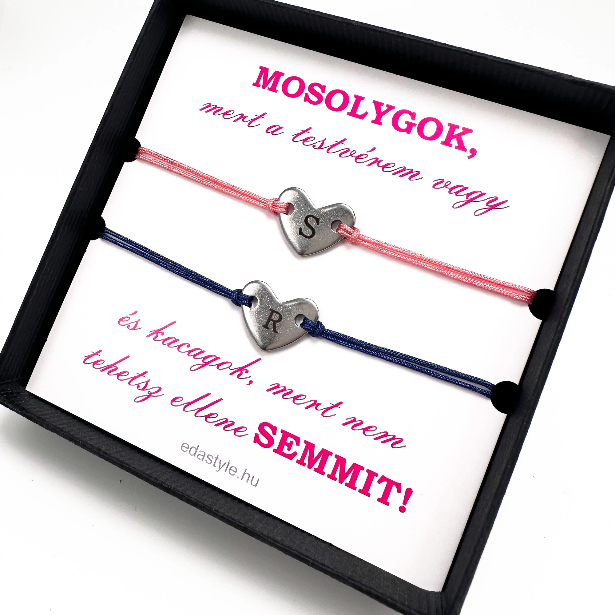 Testvér zsineg karkötő gravírozható szív medállal Rózsaszín-Kék