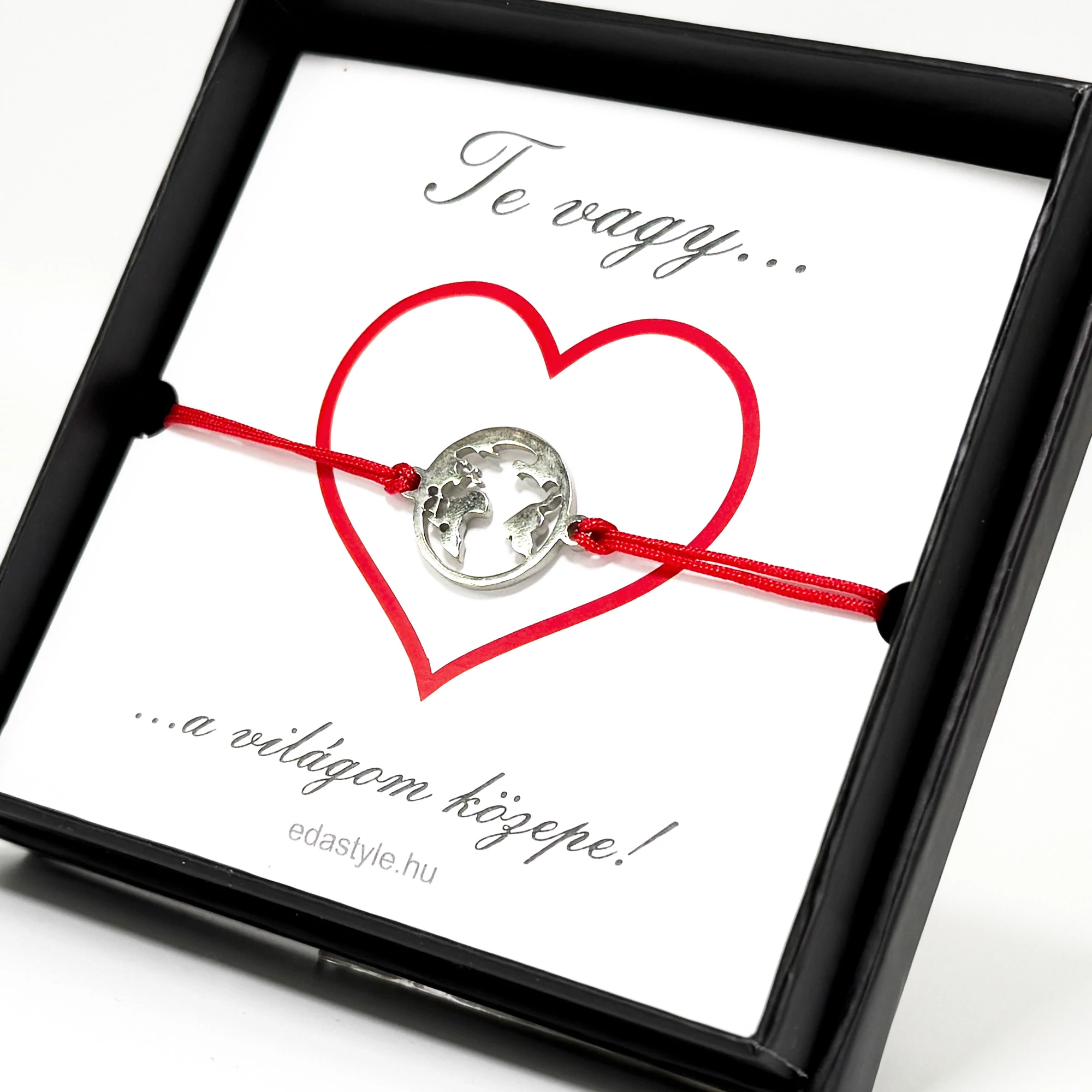 Világom közepe... zsineg karkötő földgömb medállal Piros-ezüst